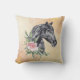 Travesseiro com uma bela ilustração de uma cabeça de cavalo preto com um rico de embelezamento floral ao lado do pescoço. Pintura de animais elegante e elegante. O plano de fundo tem um design abstrato de rico em uma cor amarela clara com marcas de ouro falsas.