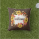 Este travesseiro decorativo projetado por colagem apresenta um design de outono sobre um fundo castanho escuro. A coroa foi criada pela colocação manual de uma variedade de flores e folhas da temporada de outono. O centro do travesseiro é onde você irá personalizar com seu próprio texto ou comprar, como mostrado como "Bem-vindo". Use este travesseiro na sua varanda para receber convidados em sua casa ou no seu pátio. Se preferir usar dentro de casa, escolha outro tecido.