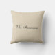 Um travesseiro de decoração de cor bege e bronzeado, insira o nome e o nome da família na parte frontal e na parte traseira usando o botão personalizar este modelo ou personalizar. Outros estilos disponíveis.