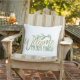 Travesseiro decorativo com elegante cor d'água verde e impressão de ouro com as palavras "Bem-vindo à nossa varanda" na frente. Coordenando o impressão floral atrás. Ver toda a nossa decoração na nossa loja Zazzle!