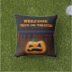 Bem-vindos ao seu lar com este travesseiro. Coloque este travesseiro na sua varanda ou em outras áreas de assentos exteriores. Este travesseiro apresenta um design de abóbora de lanterna Jack O assustador em um fundo preto.