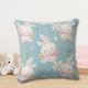 Um adorável coelho branco, flores e imagens de borboletas compõem o padrão deste travesseiro para berçário de bebê. As imagens são colocadas em um fundo azul pastel em ambos os lados do travesseiro. Um presente maravilhoso para chá de bebê!