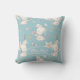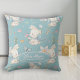 Um adorável coelho branco segura uma flor rosa no padrão deste travesseiro decorativo para berçário. Perto da parte inferior há um oval com o nome do bebê e a data de nascimento. Tudo está colocado sobre um fundo azul médio. A parte de trás da almofada tem o mesmo padrão sem o oval ou texto. Um presente de chá de bebê fofo!