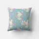 Um adorável coelho branco segura uma flor rosa no padrão deste travesseiro de berço. Perto da parte inferior há um oval com o nome do bebê e a data de nascimento. Tudo está colocado sobre um fundo azul médio. A parte de trás da almofada tem o mesmo padrão sem o oval ou texto. Um presente de chá de bebê fofo!