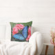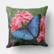 Travesseiro decorativo em cores azul, rosa e verde. Bela borboleta Blue Morpho contra o fundo de rosas florescentes.