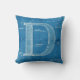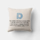 A detailed blueprint-style illustration of the letter D is presented against a vibrant blue background. The letter itself is rendered in white, with intricate details and precise measurements indicated by thin white lines. The back of the pillow includes a blue outline of the letter D set against a textured light beige background with a 4-line poem about the letter below.