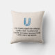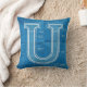 A detailed blueprint-style illustration of the letter U is presented against a vibrant blue background. The letter itself is rendered in white, with intricate details and precise measurements indicated by thin white lines. The back of the pillow includes a blue outline of the letter U set against a textured light beige background with a 4-line poem about the letter below.