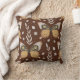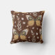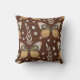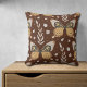 Este travesseiro decorativo apresenta um padrão de borboleta, folha e designs de flores no estilo de bô em um fundo castanho profundo. As cores usadas nas imagens incluem o bronzeado, o azul claro e o azul marinho. Ambos os lados do travesseiro têm o mesmo padrão.
