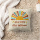 Este na moda, travesseiro decorativo personalizado apresenta um guincho luminoso desenhado à mão em tons retrorados de terracota, amarelo-ouro e aqua. O verso contém uma ilustração de sol correspondente. Os acentos estelares pequenos podem ser ajustados, se necessário, dependendo do comprimento do nome. Uma sobreposição texturizada adiciona ao visual retrô/vintage! *Ilustração original de Impressões Orabella.