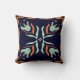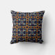 A bold decorative throw pillow featuring an original geometric ornamental pattern in navy, rust, cream, and pale sage tones.
