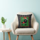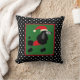 Travesseiro decorativo moderno e festivo apresenta fundo bolinhas preto e branco com poodle preto no chapéu de Santa e suéter no quadrado verde central.