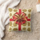 Travesseiro moderno do feriado, creme com bolinhas Dourados, e envolvido para olhar como um presente de Natal com fita vermelha e vermelho & arco do ouro.