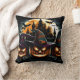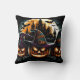 Três abóboras entalhadas com grinos estranhos brilham intensamente contra um céu crepúsculo, emolduradas por morcegos e um castelo assombrado banhado à luz da lua.
