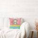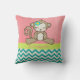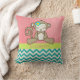 Um travesseiro personalizado com um desenho animado de um adorável macaco marrom sentado. Ela tem bochechas cor-de-rosa e azuis para uma cutena kawaii adicional. Ela também tem uma pequena flor azul no cabelo. Diversão e design capricho. Colocada sobre uma combinação de textura de shabby rosa e chevrons verdes azuis. Personalize com seu nome ou outro texto em uma borda de verde limão.