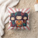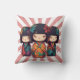 Este travesseiro decorativo adorável apresenta 3 bonitinhas e coloridas bonecas kokeshi japonesas.