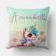 Este travesseiro decorativo mágico e encantador apresenta um lindo unicórnio bebê com cabelo arco-íris e grandes olhos. O doce pequeno unicórnio está sentado sobre uma nuvem brilhante azul e rosa, e vários corações cor-de-rosa estão flutuando ao seu lado. O fundo é um padrão de gradação do arco-íris. Um nome de exemplo é impresso na parte superior que você pode personalizar para incluir seu próprio nome personalizado ou texto.