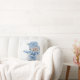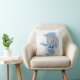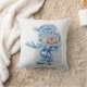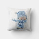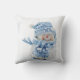 Travesseiro com uma fotografia fofa de um pequeno boneco de neve. Lá fora, no inverno, com neve caindo por toda parte. Esta cara bonita está vestida de chapéu azul e cachecol.