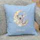 Este travesseiro decorativo personalizado apresenta um lindo coala bebê amaldiçoado dormindo em uma lua crescente com estrelas brilhantes em um fundo azul pastel branco.
