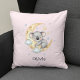 Este travesseiro personalizado apresenta um belo coala bebê amaldiçoado dormindo em uma lua crescente com estrelas brilhantes sobre um fundo branco e pastel, cor-de-rosa macio.