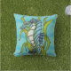 Este travesseiro exterior para o seu decoro doméstico tem um bonito dragão tipo fantasia cavalo marinho em tons de azul aqua e verde com um estômago branco com a cauda enrolada em torno de algas verdes sobre um fundo azul aqua com faixas desbotadas.