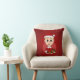 Travesseiro decorativo com uma ilustração de um lindo rapaz caucasiano sorridente com cabelo loiro curto, o menino está vestindo uma fantasia de Papai Noel com um chapéu vermelho e segurando um presente; em um círculo vermelho sobre fundo vermelho, um desenho de Natal design