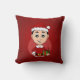 Travesseiro decorativo com ilustração de um lindo garoto caucasiano sorridente com cabelo preto curto, o garoto está vestindo uma fantasia de Papai Noel com um chapéu vermelho e segurando um presente