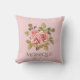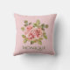 O travesseiro decorativo floral personalizado apresenta uma ilustração antiga de rosas bonito rosa, com texto elegante personalizável sobre fundo cor-de-rosa pastel.