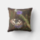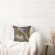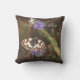 Travesseiro decorativo com foto de estilo vintage em tons quentes. Lindas borboletas negras e brancas e flores azuis em fundo castanho escuro. Adicione um sotaque de verão encantador à sua decoração!