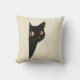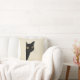 Um gato preto minimalista que olha de lado de uma página branca vazia com uma almofada brilhante, colorida, mínima e de cor pastel clara.