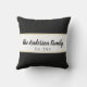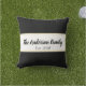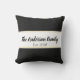 Este travesseiro preto e branco pode ser personalizado com seu texto feito sob encomenda tal como um nome de família no roteiro preto. O texto publica-se em uma grande listra branca que vá através do centro. Sob o nome de você pode adicionar o ano onde a família foi estabelecida ou supressão. Uma linha fina do ouro do falso (não folha) é acima e abaixo do texto.