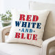 design na moda de travesseiro de feriado de 4 de julho apresenta um design de tipografia "Branco Vermelho e Azul" em vermelho, branco, azul, marinho com sotaques estelares. Um marinho azul de coordenação com padrão de estrela branca aparece no verso.