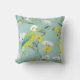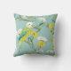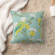Belo travesseiro decorativo de aves amante, apresentando um bordão verde e amarelo com flores amarelas e brancas sobre fundo de terra macia.