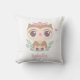 Uma adorável coruja bebê com um laço de bolinhas rosa está sentada em um remendo com várias flores. Padrão de bolinhas no outro lado da almofada. Personalize com o nome no modelo de texto fornecido. Perfeito para decorar o quarto de uma menina bebê ou quarto de meninas!