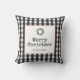 Este travesseiro decorativo de Natal apresenta o texto moderno da máquina de escrever negra "Feliz Natal" sobre um fundo de xadrez preto e branco. O design é acentuado com uma coroa de férias. Personalize este estilo de tendência com o seu nome de família.