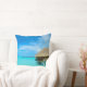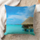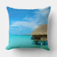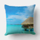 Travesseiro decorativo com um bungalow do overwater da lua de mel em um recurso luxuoso na lagoa azul clara da ilha do Pacífico de Bora Bora, perto de Tahiti no arquipélago de Polinésia francesa.