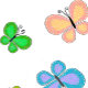 Fun multicolor folk art style butterflies fly over this sunny yellow and white stripe background.