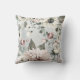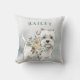Um cachorro de aquarela fofo enfeitado em flores é frente e centro em uma floresta de majestosas árvores verdes. O topo do travesseiro tem um lugar onde você pode personalizar com um nome. No verso há buquês florais de cor aquosa.