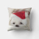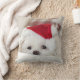 Um travesseiro com uma fotografia adorável de um cãozinho branco giro vestindo um chapéu de natal vermelho.