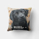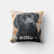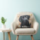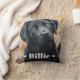 Travesseiro decorativo com a foto personalizada de seu animal de estimação com o nome do animal de estimação como uma sobreposição de texto branca flanqueada por dois corações.