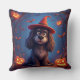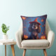 Cachorro alegre em estilo cartoon usando um chapéu de mago. O cachorro está cercado por decorações de Halloween, incluindo abóboras esculpidas com rostos assustadores, morcegos voando e folhas de outono.