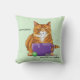 Um gato de mesa cor de laranja giro sentado em frente a uma caneca de café roxa ao fundo do verde