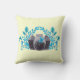 Um travesseiro com um design de aquarela fofo para obturadores. Uma câmera preta cercada por folhas azuis azuis e borboletas em um arranjo decorativo bonito. Colocado sobre um fundo amarelo pálido.