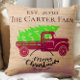 Este travesseiro de Árvore de Natal da Farmhouse, estilo antigo, é personalizado com seu nome de família e ano — apresentando um caminhão vermelho, árvore de Natal verde e um ornamento que diz 'Feliz Natal'. O presente perfeito para recém-casados. Personalize com o ano em que foi estabelecido!