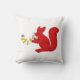 "(Sem Fio) Um esquilo que mantém uma buzina de caça sem cordas, ganchada ou manchada." Crachá de Populace para o Cantão de Akornebir na Sociedade de Anacronismo Criativo. O verso do travesseiro é um padrão medieval em cores de coordenação. A cor de fundo (mostrada em branco) pode ser alterada mediante solicitação.