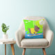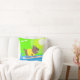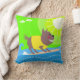 O cão de sorriso está em sua prancha e em vestir uma jaqueta de vida amarela. O sol está brilhando no céu verde e o cão está montando as ondas azuis. O verso do travesseiro é azul com bolinhas.