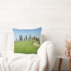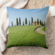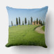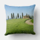 Coxim do travesseiro decorativo da foto com uma estrada curvy através das colheitas de grão para uma casa de campo da fazenda com uma fileira de árvores de cipreste na frente dela perto de Pienza no vale do d'Orcia de Val em Toscânia, Italia.