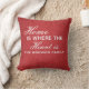 Um travesseiro decorativo personalizado que apresenta o sobrenome da família escrito sobre um fundo têxtil vermelho junto com o texto "Casa é onde está o coração". Este travesseiro decorativo personalizado faz um presente de excelente para qualquer ocasião.
