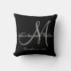 O travesseiro monogrammed preto e branco e cinzento personalizado com inicial do sobrenome, nomes dos noivos e casamento data na folha de prova da tipografia da pia batismal do roteiro impressa em um fundo da cor sólida. Elke Clarke© para MonogramGallery em Zazzle. Faz um grande presente para recentemente weds ou o casal do casamento. Acessório elegante, na moda para seu quarto, cadeira favorita, como a decoração da casa do divertimento em sua sala de família ou a adição decorativa formal a sua sala de visitas como uma lembrança do casamento.
