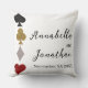 Este travesseiro decorativo personalizado apresenta um tema do cassino de Las Vegas. Os quatro naipes num baralho são impressos à esquerda num padrão horizontal. A pá é um design preto, o clube é ouro, o diamante é prata, e o coração é um design vermelho-brilhante. Os nomes do casal e da data do casamento da amostra são impressos à direita em uma fonte preta elegante.