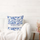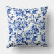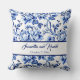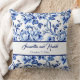 Uma almofada de casamento com um design floral toile azul e branco e espaço para o nome dos noivos e data do casamento.